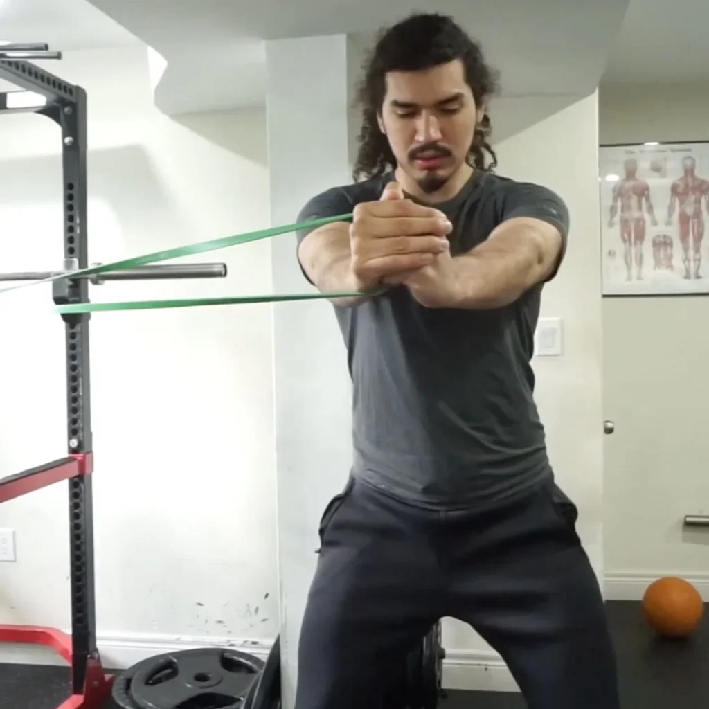 チューブをどこかに引っ掛けて、少し伸ばした状態から真横に引っ張る。体幹とお腹の横外腹斜筋を鍛えることが出来る。腹筋が強くなるとスイングがブレずらくなり、最短でヘッドを走らすことが出来るので、結果的にスイングが早くなる