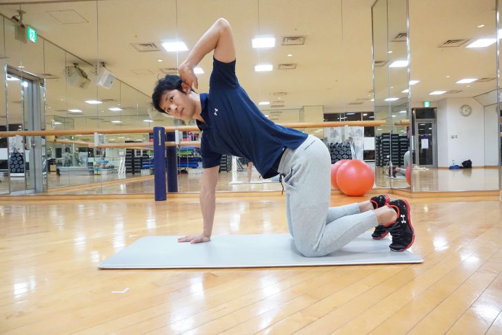 2.手を頭に置いた方に開いていく(骨盤は開かないように)
